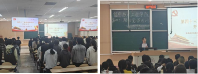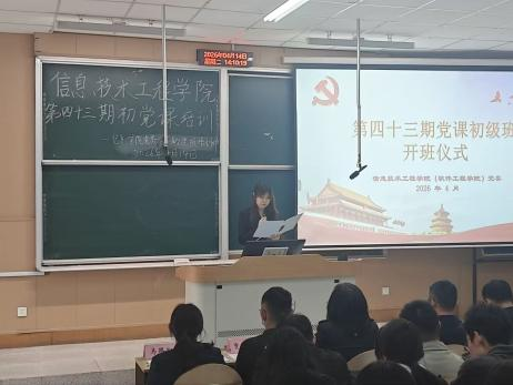 【通讯员:马路阳、代晓辉、马鑫芃】为深入学习贯彻习近平新时代中国特色社会主义思想,扎实做好入党积极分子与预备党员思想教育工作,持续筑牢青年学子政治信仰根基,4月14日下午,信息技术工程学院党委第43期初级党课培训班在阶梯教学楼103室隆重开班。学院党委书记蔡振山,党委副书记兼副院长、纪委书记王蕾,组织员,各学生党支部书记及辅导员出席开班仪式,预备党员、第43期入党积极分子112人参加了此次活动。