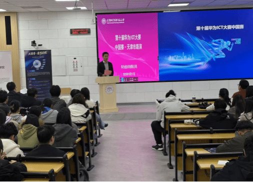 活动伊始,我校信息技术工程学院院长刘建卿与华为ICT学院合作总监魏彪分别致辞。在随后的赛事解读环节,华为专家详细介绍了大赛规则与参赛价值。第九届大赛全球特等奖获得者、我校计科2113班姜博豪同学也亲临现场,分享了宝贵的参赛经验与心得,激发了在场师生的浓厚兴趣。在互动答疑环节,师生们踊跃提问,与华为及校方嘉宾进行了深入交流。